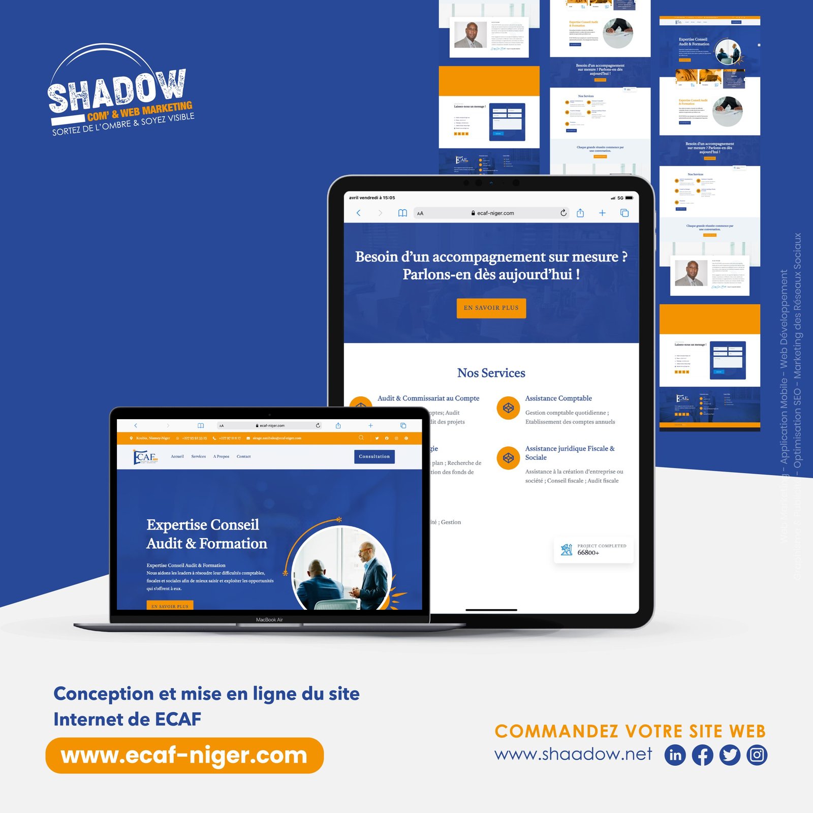 La création d’un site web pour le cabinet ECAF (Expertise, Comptabilité, Audit et Formation) a été un projet à la fois exigeant et plein de promesses. Ce projet avait pour but d’établir une vitrine numérique qui reflète l’expertise et la rigueur d’un cabinet de conseil financier moderne. Le défi consistait à concevoir une plateforme élégante et intuitive, capable de présenter une offre de services diversifiée (comptabilité, audit, conseil, formation) tout en inspirant confiance et professionnalisme.